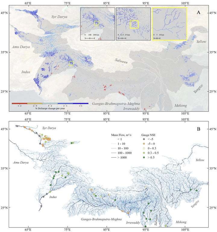 Spatial patterns of river discharge for ∼114,000 reaches across 9 HMA basins. (a) significant ( p‐value <0.05)trends in mean annual river discharge from 2004 to 2019. Only reaches with significant changes are shown. Inset maps showriver reaches near Maharana Pratap Sagar reservoir in Northern India and illustrates the spatial resolution of the study.(b) Mean discharge for the study period as well as the model performance in terms of Nash‐Sutcliffe efficiency (NSE).High Mountain Asia (HMA) plays a crucial role in Asian hydrology—its vast snow and glacier-covered landscape significantly influences downstream river water supply for billions of people. Understanding the spatiotemporal pattern of river discharge in HMA aids effective water resource management and infrastructure planning. In this study, we used a combination of hydrologic modeling and assimilation of remotely sensed discharge from Landsat and PlanetScope imagery to investigate how daily river discharge has changed for more than 114,000 reaches across HMA between 2004 and 2019. We observed significant increasing trends in river discharge for 11,113 reaches (∼10%), particularly in smaller rivers of the Syr Darya, Indus, Yangtze, and Yellow River basins. The ratio of total glacial melt and precipitation received by individual river reach showed an average significant increase of 2.2% per year, particularly in the Syr Darya, Amu Darya and Western Indus rivers. Across HMA, our results also indicate that 8% of river reaches with either planned and existing hydropower plants or dams experienced a statistically significant average increase of 2.9% per year in stream power. These findings illustrate the rapidly changing patterns of river discharge and stream power in HMA.