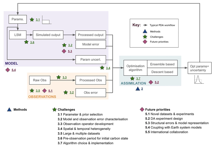 Schematic of the parameter data assimilation (PDA) workflow for land surface models, illustrating the interactions between model, observations, and assimilation components. Methods ,challenges and future priorities are highlighted.Accurately predicting terrestrial ecosystem responses to climate change over long-timescales is crucial for addressing global challenges. This relies on mechanistic modeling of ecosystem processes through land surface models (LSMs). Despite their importance, LSMs face significant uncertainties due to poorly constrained parameters, especially in carbon cycle predictions. This paper reviews the progress made in using data assimilation (DA) for LSM parameter optimization, focusing on carbon-water-vegetation interactions, as well as discussing the technical challenges faced by the community. These challenges include identifying sensitive model parameters and their prior distributions, characterizing errors due to observation biases and model-data inconsistencies, developing observation operators to interface between the model and the observations, tackling spatial and temporal heterogeneity as well as dealing with large and multiple data sets, and including the spin-up and historical period in the assimilation window. We outline how machine learning (ML) can help address these issues, proposing different avenues for future work that integrate ML and DA to reduce uncertainties in LSMs. We conclude by highlighting future priorities, including the need for international collaborations, to fully leverage the wealth of available Earth observation data sets, harness ML advances, and enhance the predictive capabilities of LSMs.